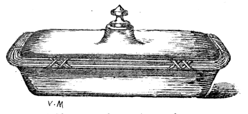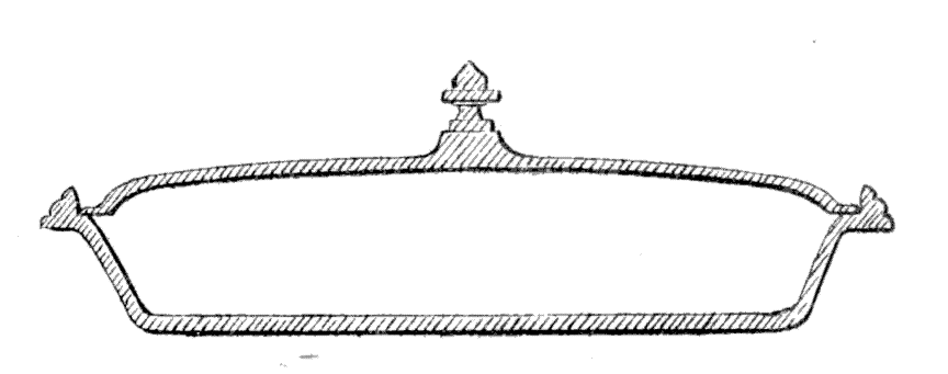 Nous croyons y avoir réussi en faisant adopter le plat carré représenté ci-contre, et qui, après avoir fait ses débuts au Ritz-Hôtel de Paris, reçut sa consécration définitive au Carlton-Hôtel de Londres. Les avantages résultant de son emploi sont inappréciables, et nul ne peut s'en faire une idée s'il ne s'en est servi. Il tient peu de place ; les articles dressés à l'intérieur ne sauraient refroidir, car ils sont clochés de près par le couvercle. Les morceaux de poisson ou de viande, au lieu d'être entassés, peuvent y être disposés côte à côte avec leur garniture à portée, de telle façon que le mets est aussi appétissant pour le dernier que pour le premier convive servi. Enfin il supprime absolument, les croûtons, papillotes, fonds de plat, bordures et hatelets, ainsi que les cloches encombrantes de l'ancien service.
